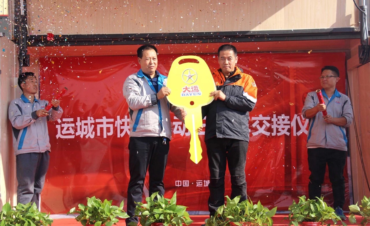 最后,在歡慶的歌聲和隆重的禮炮聲中,周總將代表著本次快遞車輛交接儀式的金色鑰匙模型鄭重的交付至楊元德會長的手中,至此,運城市快遞行業(yè)協(xié)會-大運快遞車交接儀式圓滿落下帷幕。